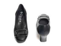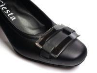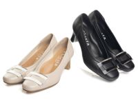 つややかなアクリルモチーフが上品に輝く、ミニマルデザインのバックルモチーフパンプス。