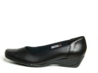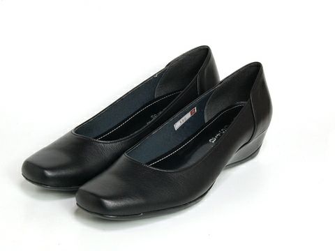 フォーマルな場でも活躍できるプレーンなブラックパンプスは使いまわし力抜群な1足。クッション性とグリップ性が高いウエッジヒールで長時間の歩行も安心です。