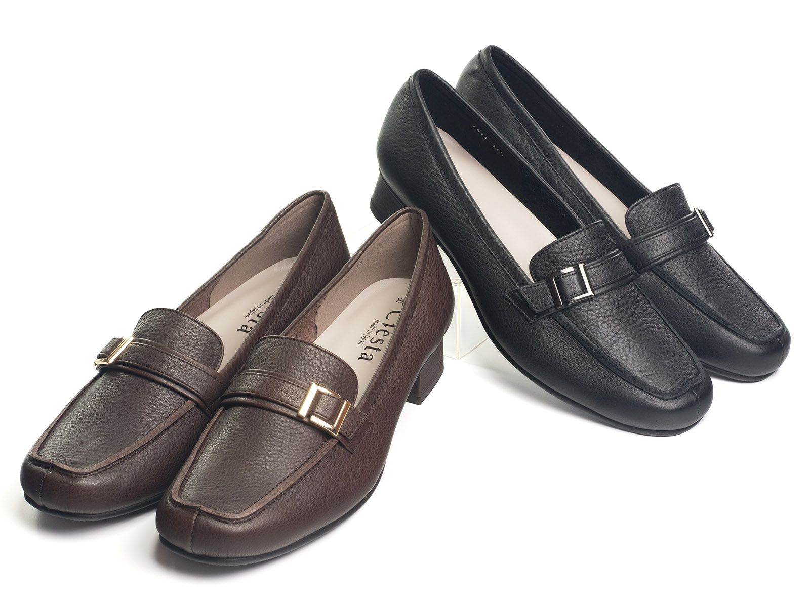 ベーシックな中に映えるゴールドバックルがポイントのベルトローファー。 かかとはしっかり支えつつ、指周りは柔らかい革で優しくフィット。 インソールのクッションも柔らかで歩きやすく、立ち仕事や通勤にも頼れる一足です。 滑りにくい靴底で安心して使えるので、お仕事にもデイリーにもおすすめです。 #パンプス #本革 #ローヒール #スクエアトゥ
